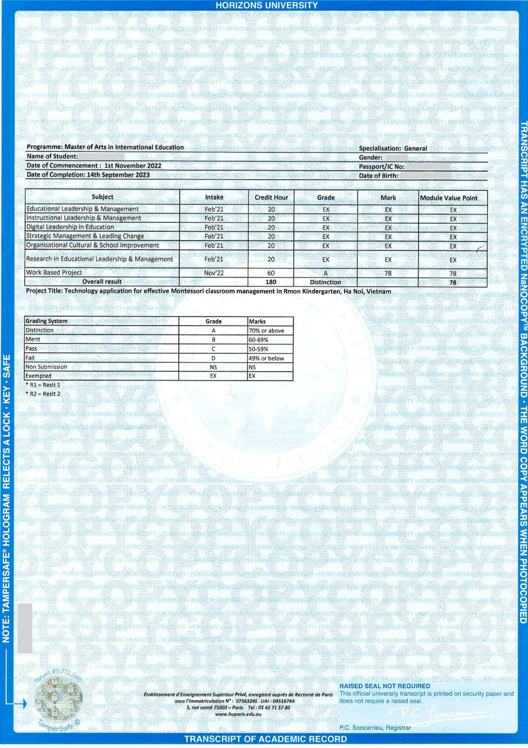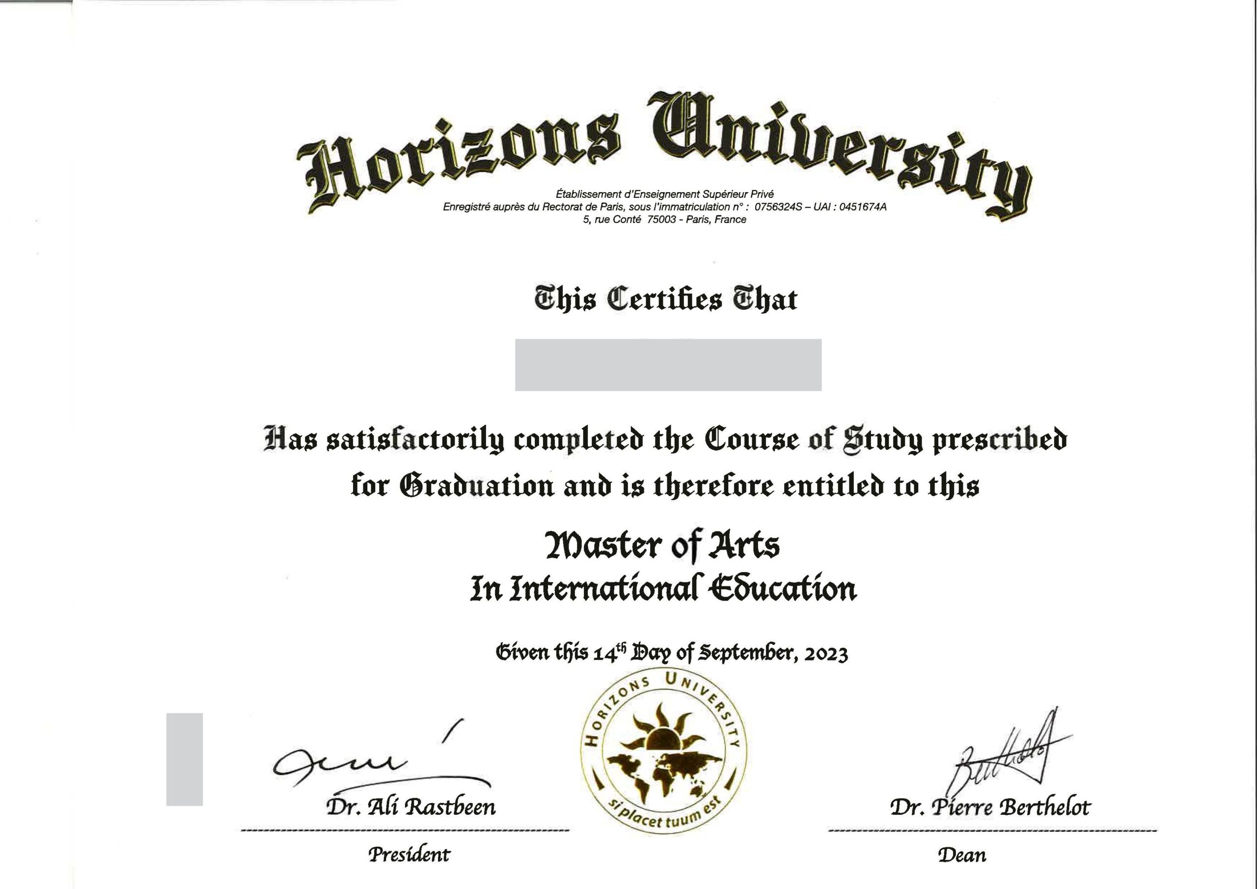 Sau khi hoàn thành chương trình, học viên sẽ nhận được bằng Master of Arts in International Education từ Horizons University.