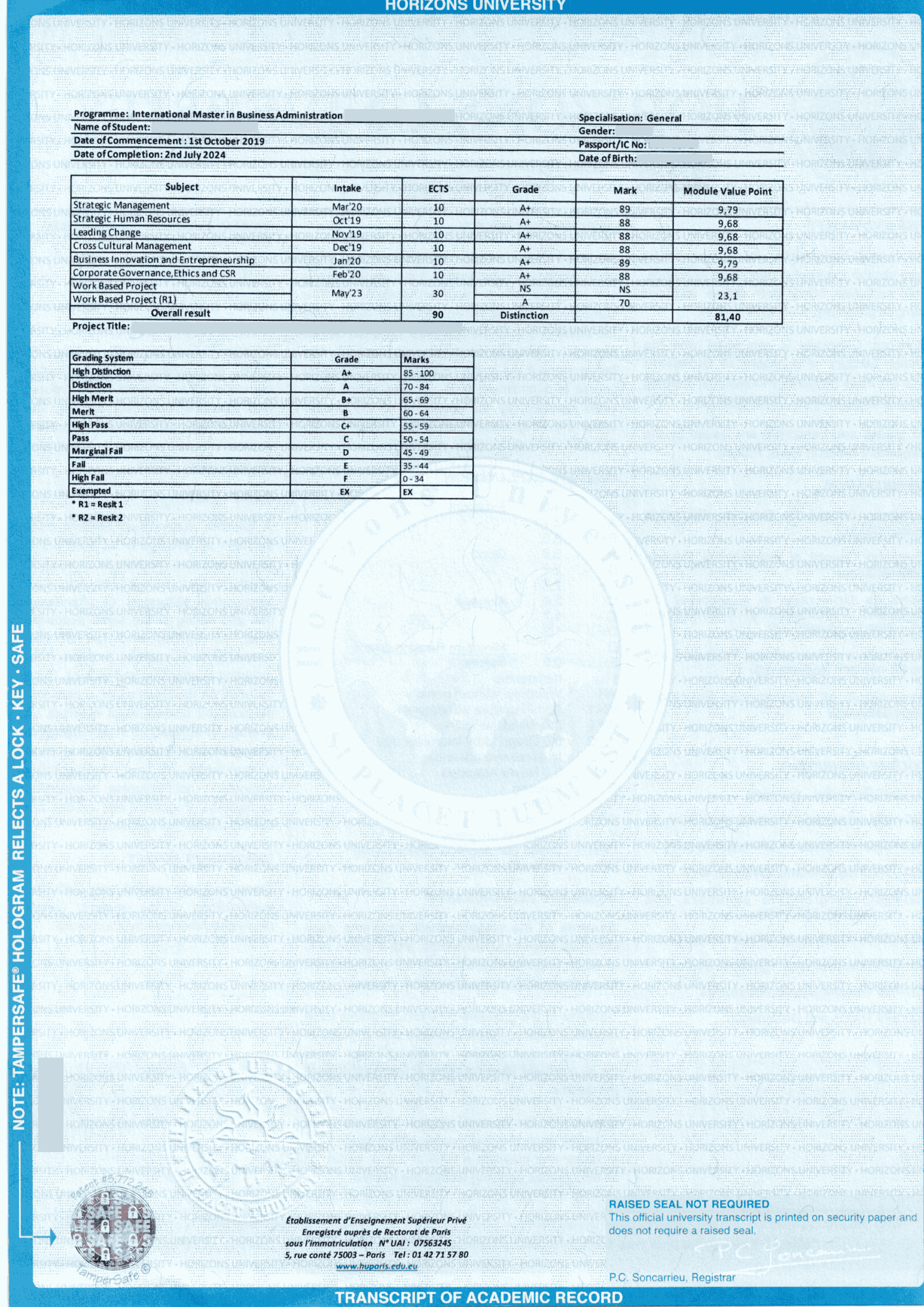 Văn bằng do Horizons University cấp thuộc nhóm văn bằng do trường Đại học cấp (Diplôme d’Etablissement), được giảng dạy bằng tiếng Anh, không phải văn bằng quốc gia Pháp (Diplômes nationaux).